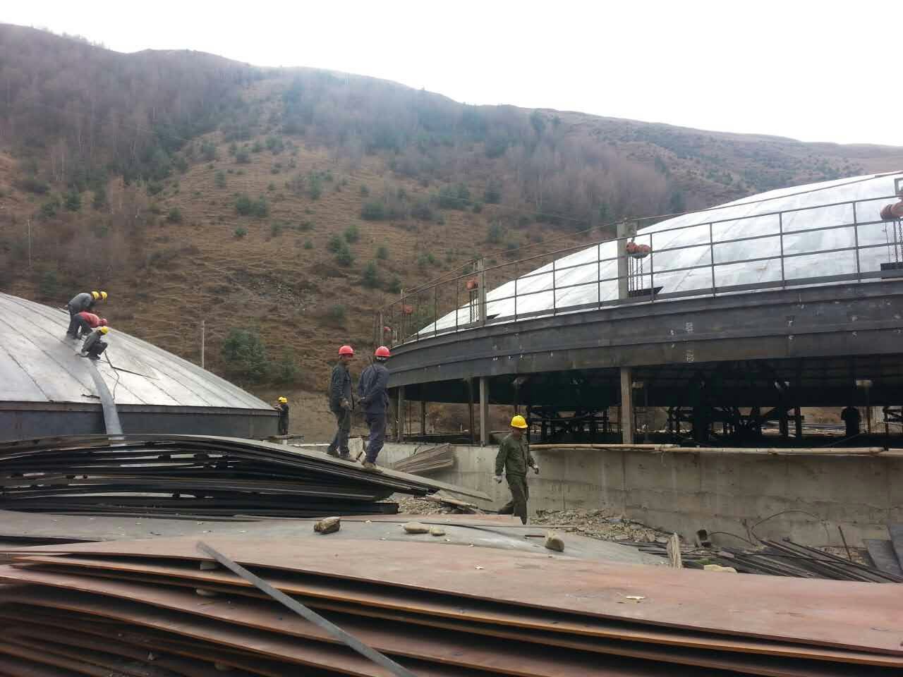五、出库先进:该大型钢板库采众家之所长,自行设计出全新气动出库系统,靠气动压力将库内物料输送到指定位置。1-5万吨设计一个出料口,5万吨以上设计4个出料口。采用变频技术,更大出库量可达500T/H左右。